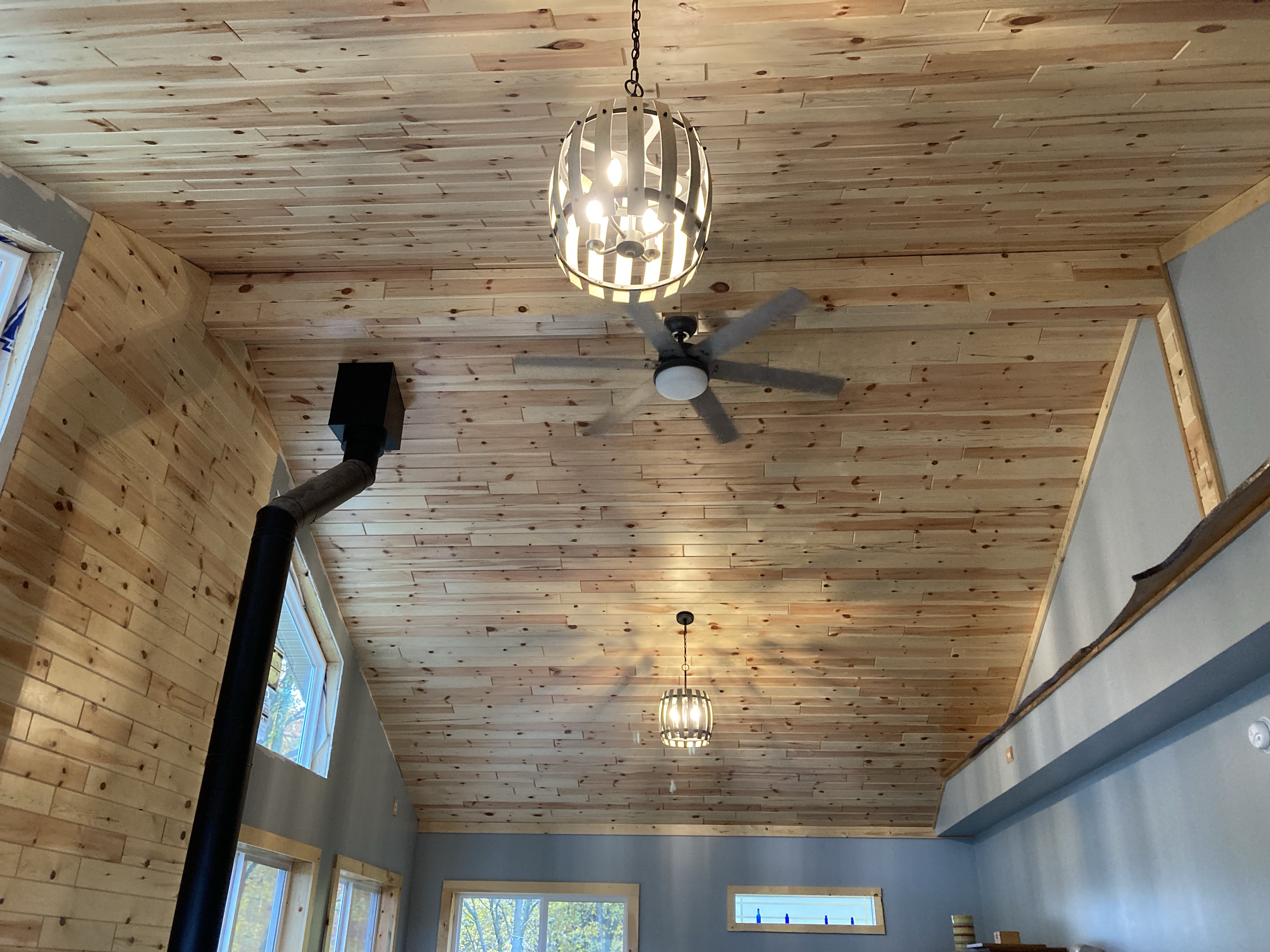 Particularly thrilled with the Michigan knotty pine ceiling…the barrel stave light fixtures also added a fun, rustic touch. Several pieces of elm from the property completed a rustic shelf spanning the room.